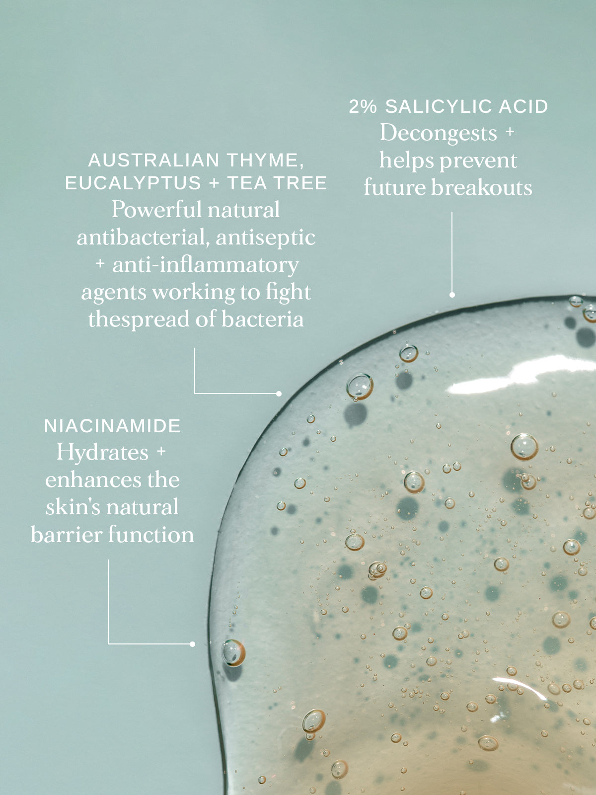 This non-stripping face and body gel formula with 2% Salicylic Acid, is specially formulated to target breakouts while reducing the appearance of inflammation and blemishes. Fortified with Thyme, Tea Tree and Eucalyptus to fight bacteria on the skin and Vitamin B3 to help control excess oil.